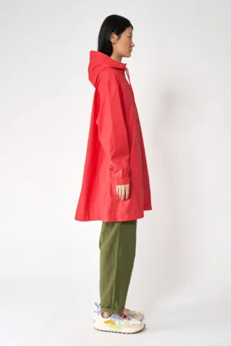 Die wasserdichte Dhuda Jacke von Tantä Rainwear ist ein kurzes, locker geschnittenes Modell aus wasserdichtem Baumwollmischgewebe. Dieses zeitlose Material ist atmungsaktiv und winddicht. Zu den Designdetails gehören versiegelte Nähte, Raglanärmel, ein Doppelreißverschluss und verdeckte Druckknöpfe. Die schlanke A-Linien-Silhouette wird durch abgerundete Seitenschlitze für einen femininen Touch abgerundet.